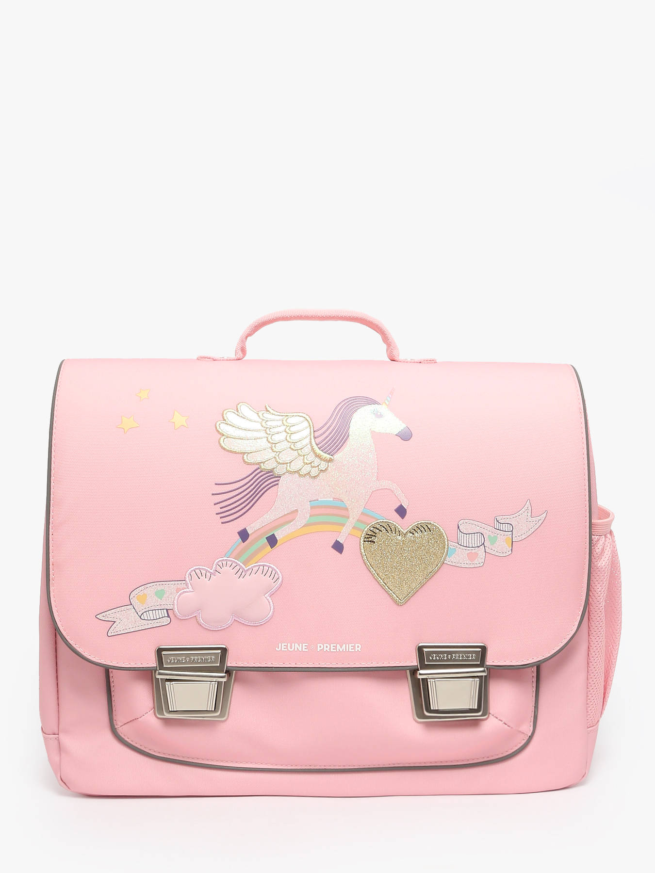 38 cm - 17.1 litres - 1.1 kg ~ Ce cartable JEUNE PREMIER à 2 compartiments est idéal pour les enfants de 6 à 8 ans, filles comme garçons. Fabriqué en polyester robuste, il accompagne les journées d’école avec confort et fonctionnalité. À l’extérieur, il dispose d’une poche avant pratique, d’une poche latérale pour gourde ou petit objet, et se ferme facilement grâce à un rabat équipé d’un fermoir sécurisé. Les bretelles réglables et la poignée assurent un port ergonomique, au dos ou à la main. L’intérieur se compose de deux compartiments spacieux, d’une poche zippée et peut accueillir un dossier A4, un cahier 24x32 cm et un classeur A4.
