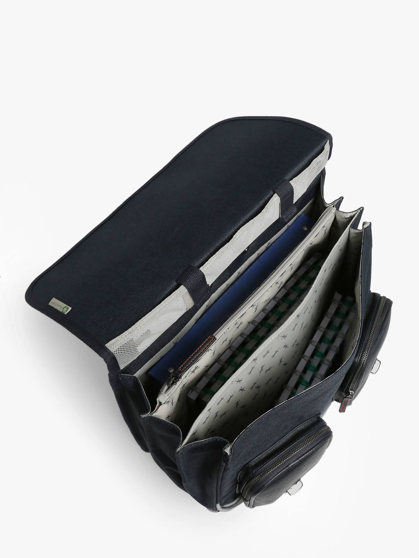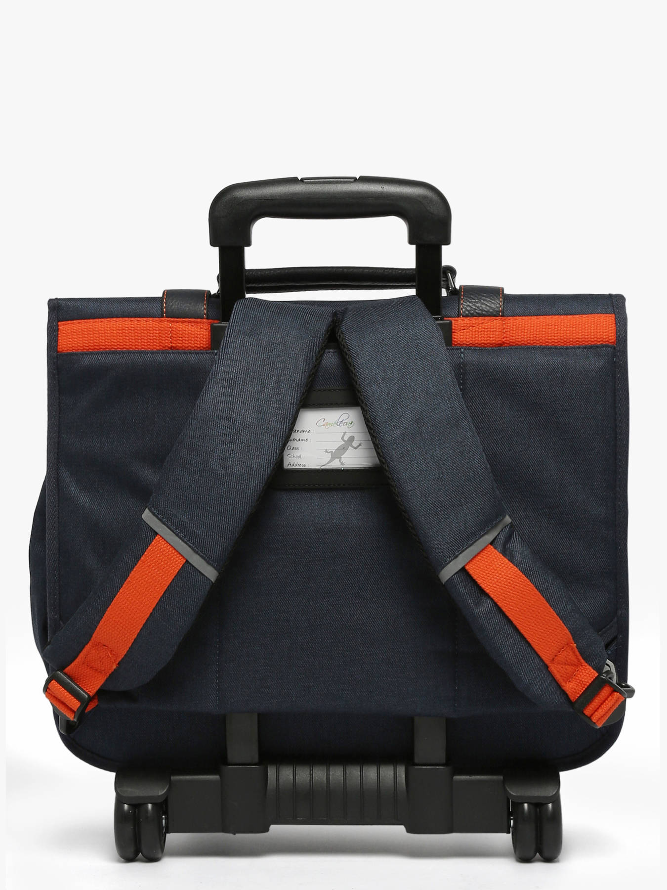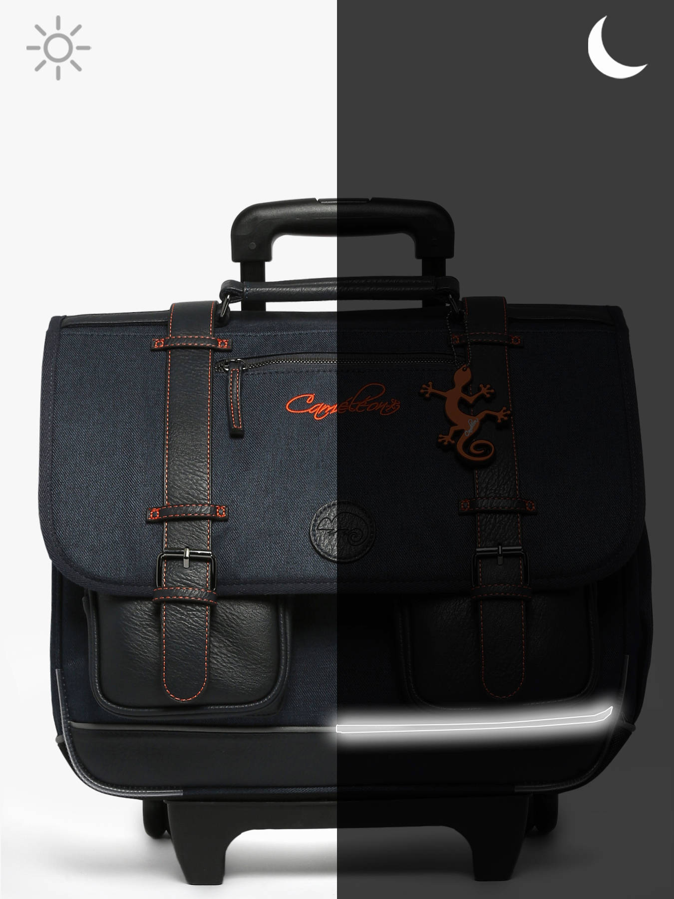 41 cm - 31 litres - 2.6 kg ~ Ce cartable à roulettes 3 compartiments 41cm de la ligne Vintage Urban de chez Caméléon est idéal pour le CM1 et le CM2. On aime ce cartable pour son grand espace, il se compose de trois compartiments permettant d’y glisser des cahiers ainsi que des classeurs allant jusqu’à 32x29x7cm. Il possède également une poche intérieure zippée. À l’extérieur, il se compose de deux poches à fermeture éclair sur le devant ainsi que d’un porte gourde latéral. Une bande réfléchissante est présente sur l’avant afin de garantir la sécurité de votre enfant. Son fond ainsi que ses côtés sont renforcés, permettant une utilisation quotidienne. Il est aussi possible de l'utiliser en sac à dos grâce aux bretelles déclipsables qui se trouvent dans la poche arrière du sac et à la protection rembourrée au niveau de l'armature des roues pour protéger le dos de votre enfant. Afin de garantir un confort optimal, les bretelles et le dos de ce cartable sont rembourrés. Petit plus, il dispose d’une étiquette nom, d’une règle offerte et de son porte-clé caméléon sur la poignée !